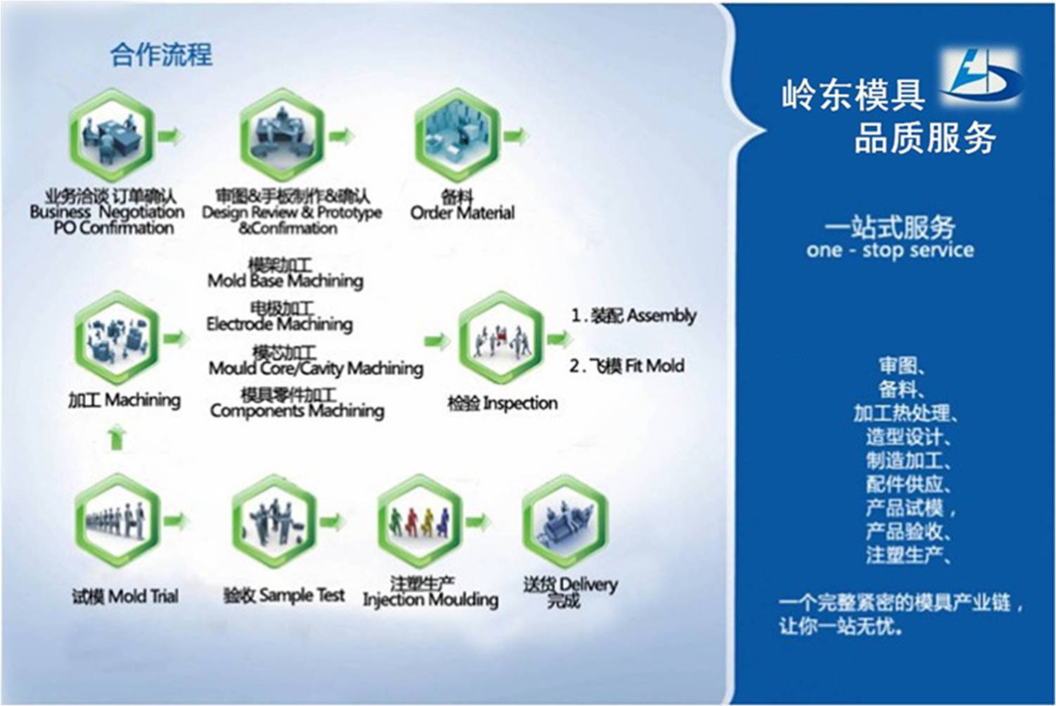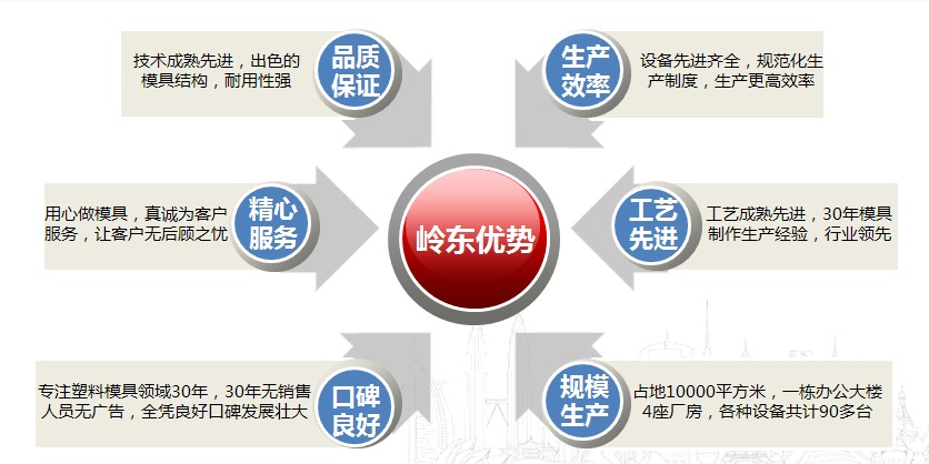揭陽嶺東模具有限公司創建于1986年,歷時20多年穩健發展,廠區占地面積10000平方米,工人技術人員近百人,是一個技術力量雄厚、設備先進、工人經驗豐富的大型民營塑料模具制造企業。公司擁有寬敞明亮的現代化標準廠房及各種先進的加工設備,其中日本哈馬伊加工中心、臺灣進口加工中心、大型龍門銑床及各種立式、臥式數控銑床共30臺,數控車床15臺,數控線切割機、數控電火花成型機、鉆床、磨床及鋸床共計32臺,大小型起重機、航車15臺。自主研發模具生產工藝及模具成型技術,特別對于制造加工大中型日用塑料模具具有極大優勢。
